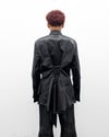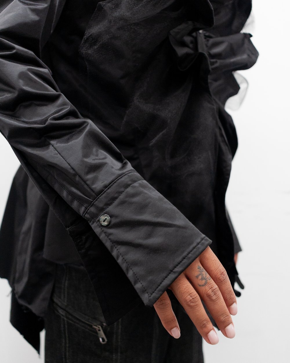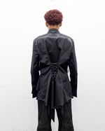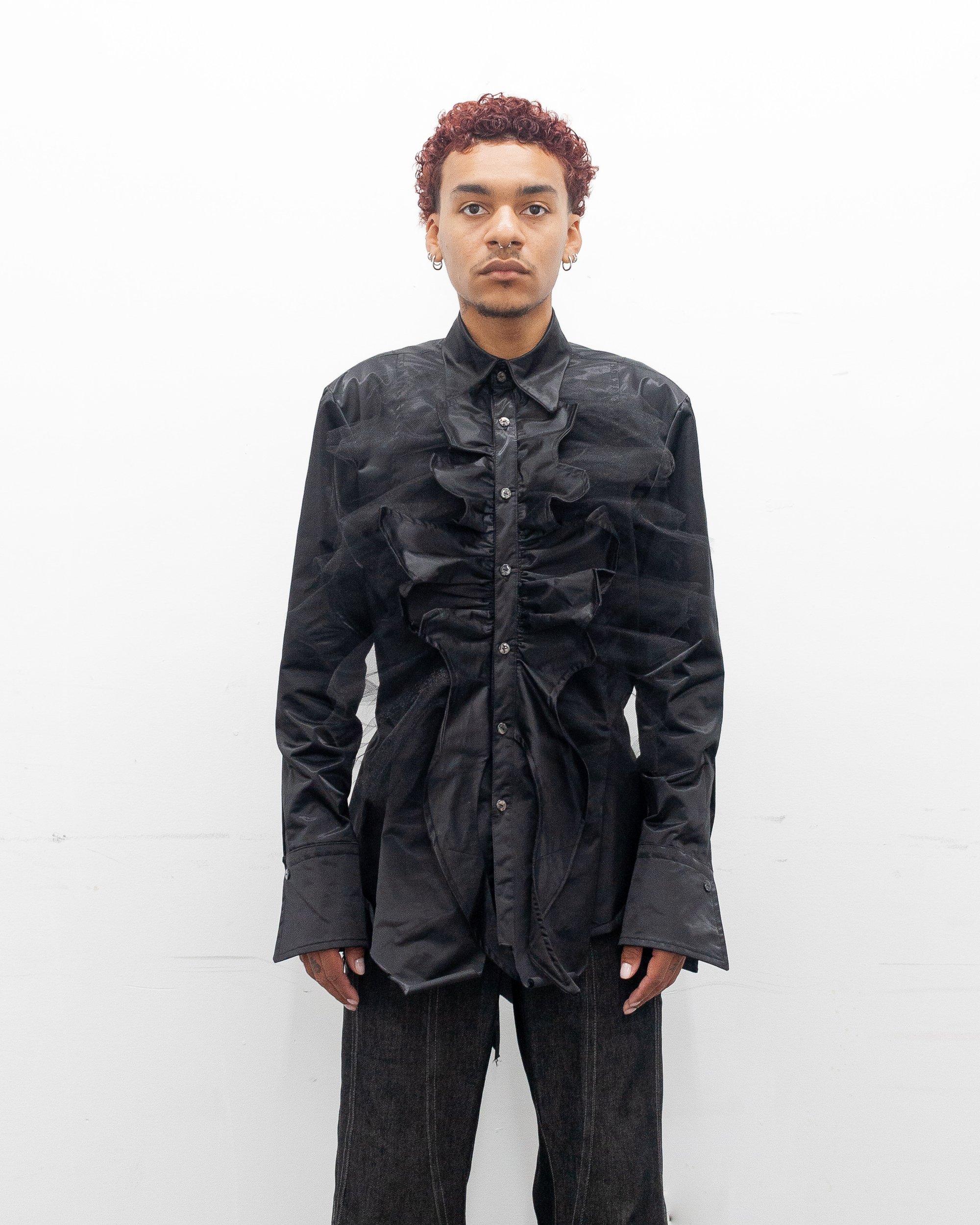 BUTTON UP HAS A SENSE OF WHAT IS TRADITIONALLY A CLASSIC BUTTON SYSTEM. HOWEVER, THIS SENSE OF "TRADITIONAL" IS INTERRUPTED WITH A RUCHED EXPLOSION OF THE SHIRTING LAYERED WITH TULLE FOR MORE FLARE. THERE IS A DOUBLE BUTTON SYSTEM FOR A HIGHER COLLAR. THERE IS A SHARP, KNIFE-LIKE FEATURE THAT TRAVELS FROM SLEEVE CUFFS. THERE IS FLARED SLEEVE CUFFS THAT CAN CLOSE WITH BUTTONS, OR FLIPPED INTO A DOUBLE CUFF FOR CUFFLINKS (IF NEEDED). THIS GARMENT HAS A PANELLED LACING SYSTEM IN THE CENTER BACK FOR A FURTHER TAILORED LOOK. THIS GARMENT HAS A RAW HEM FINISH FOR A MORE "NATURAL" FEEL.