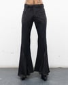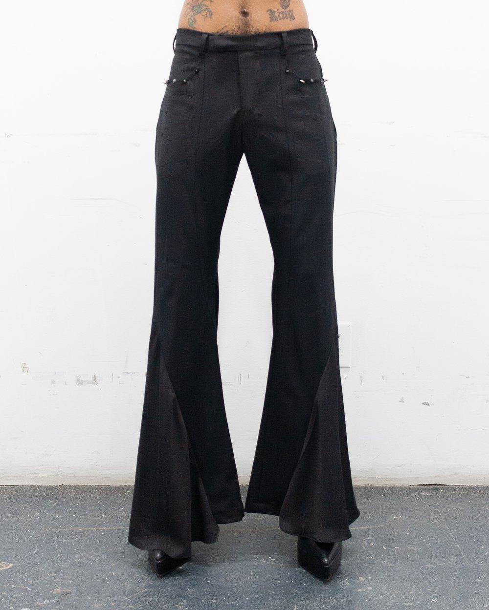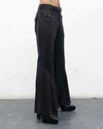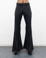 THESE PANTS ARE FLOOR LENGTH WITH A SLIM TO FLARE FIT. THEY HAVE MULTIPLE VERTICAL SEAMS. THEY HAVE A PAIR OF POCKETS BY THE WAIST THAT ARE SURROUNDED BY SPIKED HARDWARE, LIKE A GARGOYLE STATUE THAT DECORATE CATHEDRAL ARCHITECTURE. THEY HAVE A CENTER FRONT ZIPPER, A WAISTBAND THAT WORKS AS A SELF BELT THAT CLOSES WITH A ANTIQUE SILVER HOOK AND BAR. THERE IS A RUGGED BUTTON THAT ALSO ASSISTS WITH THE CLOSURE. THERE ARE TWO WELT POCKETS WITH ASYMMETRICAL FLAPS IN THE BACK OF THE GARMENT. THEY HAVE A LAYER OF LIGHTWEIGHT CHIFFON THAT FLOWS DOWN THE PANT LIKE SMOKEY WATER FOR SHIFTS IN WEIGHT WHEN WALKING, WHICH HAVE A RAW HEM FINISH.