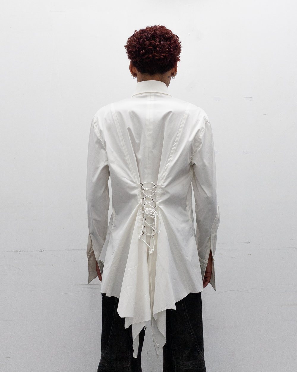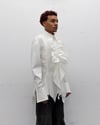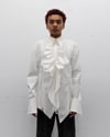 BUTTON UP HAS A SENSE OF WHAT IS TRADITIONALLY A CLASSIC BUTTON SYSTEM. HOWEVER, THIS SENSE OF "TRADITIONAL" IS INTERRUPTED WITH A RUCHED EXPLOSION OF THE SHIRTING LAYERED WITH TULLE FOR MORE FLARE. THERE IS A DOUBLE BUTTON SYSTEM FOR A HIGHER COLLAR. THERE IS A SHARP, KNIFE-LIKE FEATURE THAT TRAVELS FROM SLEEVE CUFFS. THERE IS FLARED SLEEVE CUFFS THAT CAN CLOSE WITH BUTTONS, OR FLIPPED INTO A DOUBLE CUFF FOR CUFFLINKS (IF NEEDED). THIS GARMENT HAS A PANELLED LACING SYSTEM IN THE CENTER BACK FOR A FURTHER TAILORED LOOK. THIS GARMENT HAS A RAW HEM FINISH FOR A MORE "NATURAL" FEEL.