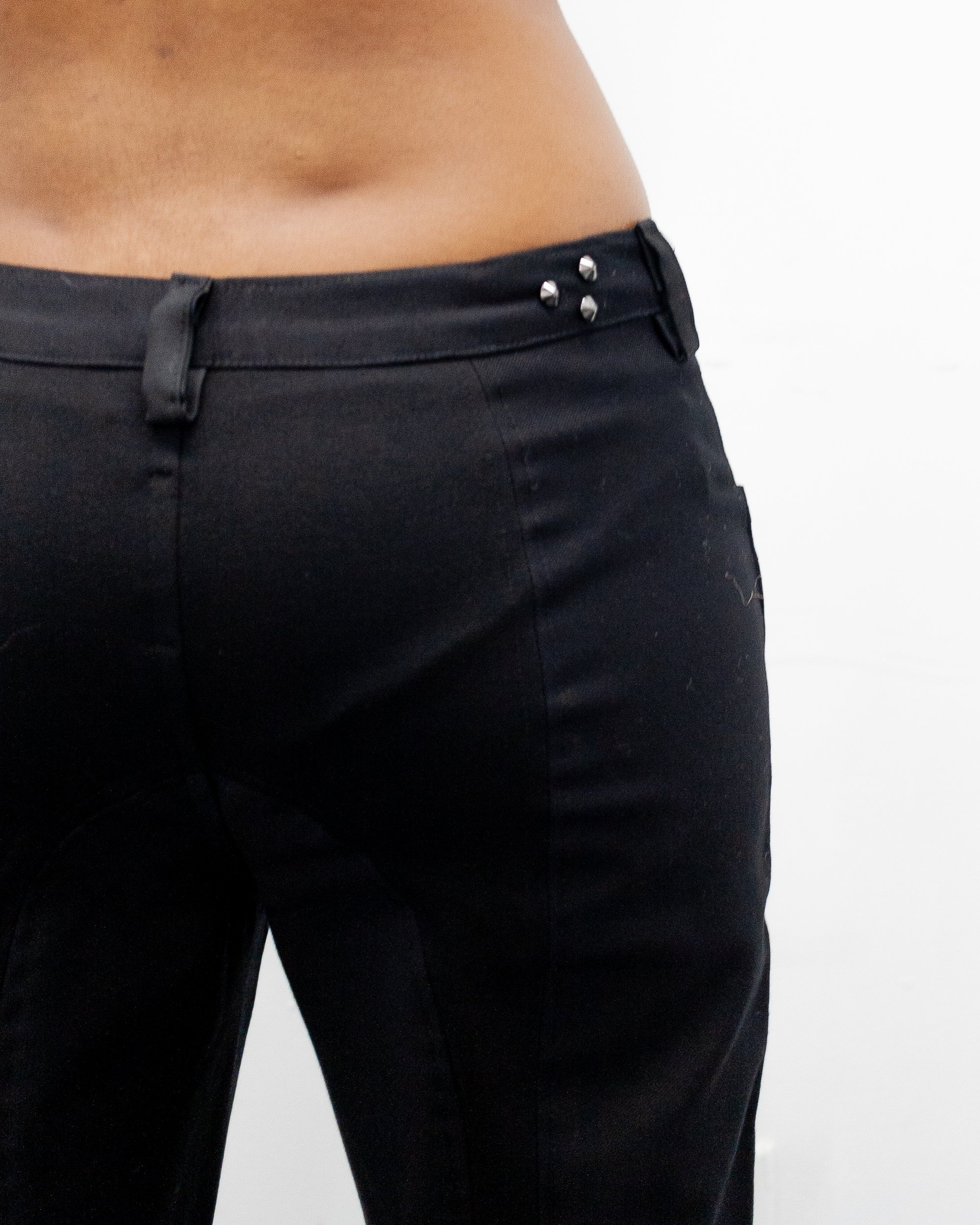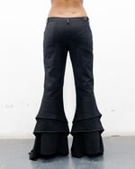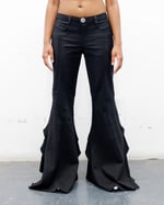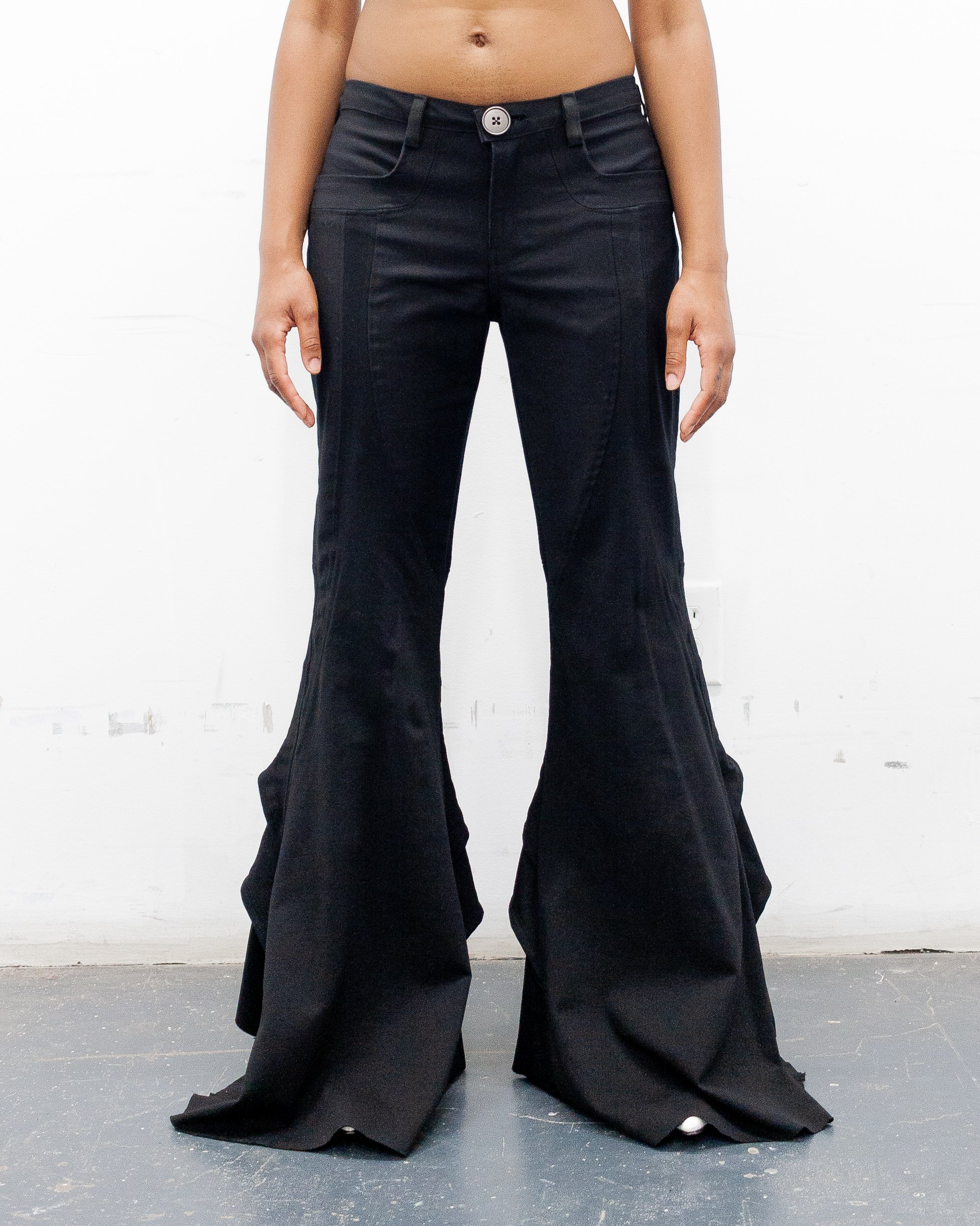 THESE MULTI PANELED PANTS ARE FLOOR LENGTH. THEY HAVE A CLOSER FIT AND FLARE FIT, PONTE KNIT PANELS FOR A MORE COMFY FIT AROUND THE FRONT THIGH AND BACK THIGH, AND RAW HEM FINISH. THESE HAVE A CENTER FRONT ZIPPER AND OVERSIZED METAL BUTTON CLOSURE. THESE HAVE POCKETS ON THE WAIST FOR SOME STORAGE. THEY HAVE THREE SMALL PIECES OF HARDWARE ON THE UPPER RIGHT AREA IN THE BACK OF THE GARMENT. THEY HAVE A LAYERED CONSTRUCTION IN THE BACK FOR THE WEIGHT OF THE PANT TO SWAY WITH MOVEMENT LIKE A GUST OF MISTY WINDS.